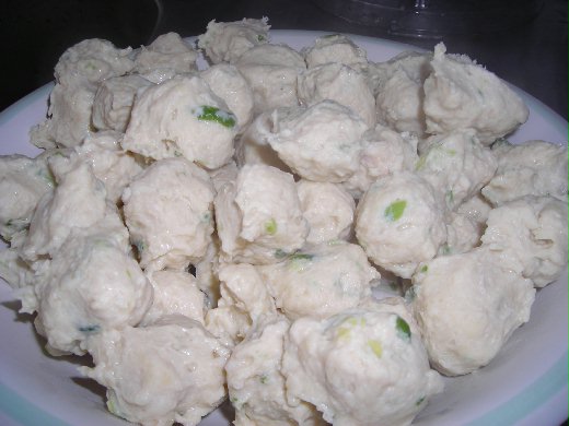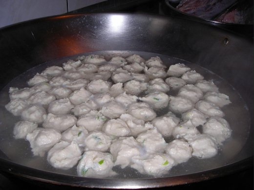 2.鍋中燒一鍋水.火不要太大.讓水維持一定的溫度(不可燒開)將雞肉漿捏成子放入鍋中煮熟即可.