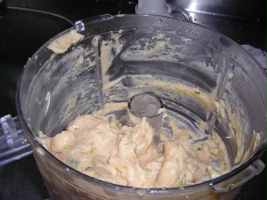 做法:1.將所有的材料放入食物調理機中再加入調味料.絞打至材料成黏糊狀成雞肉 漿備用.