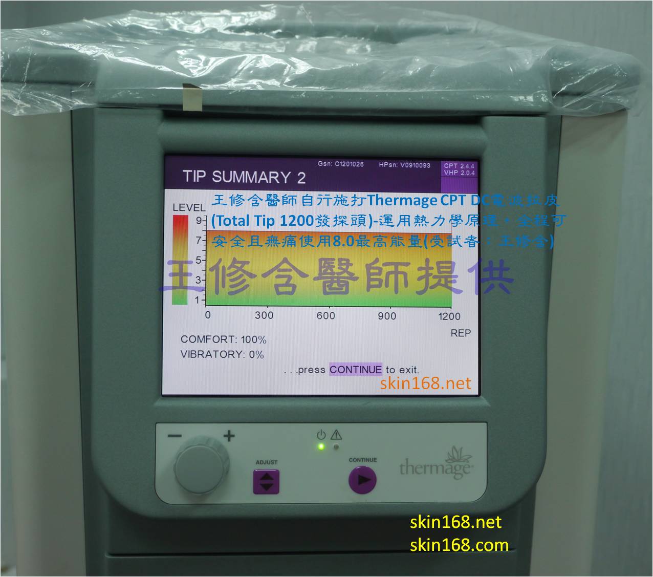 | 王修含醫師自行施打Thermage CPT DC電波拉皮 (Total Tip 1200發探頭)-運用熱力學原理,全程可安全且無痛使用8.0最高能量(受試者:王修含) |
