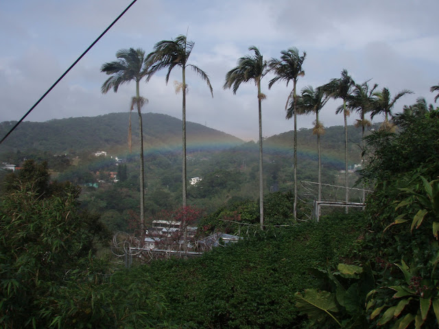 經過幾棵檳榔樹時候,突然看到美麗的圓弧形彩虹出現在對山!