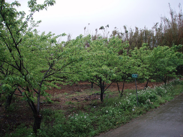 一路上沒幾戶人家,先是一些花圃,早開的櫻花樹已經綠葉滿樹!
