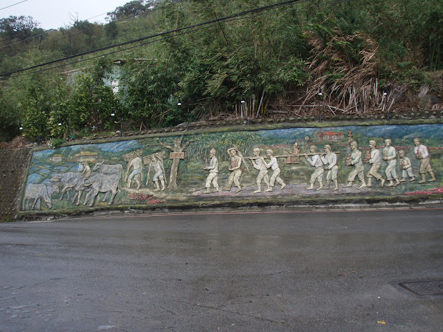 在公車候車亭對面還有一大幅的壁飾,農家生活種種,