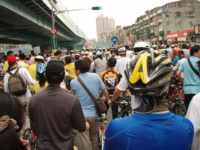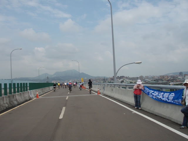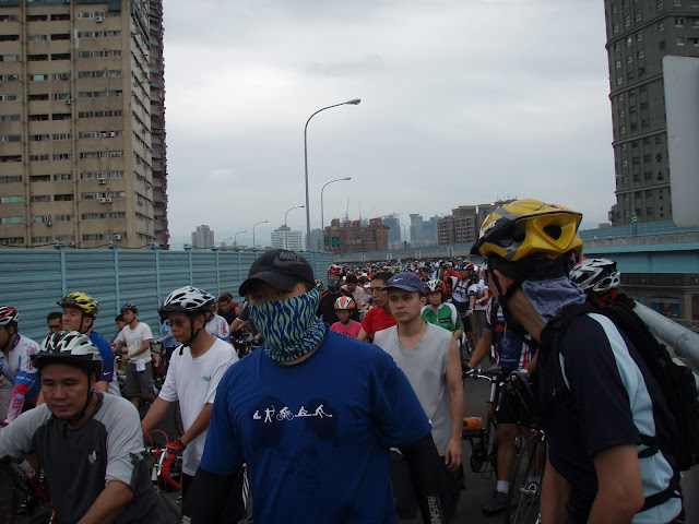 6點10分與停了出門,一路天空陰霾 積水不斷,7點騎到板橋捷運新埔站集合.這時後集合點已經人潮洶湧,騎士越來越多,8點多遠遠望去,黑壓壓一片人龍車潮!下橋及平面汽機車,上橋自行車交會,亂成一團,橋上已塞滿自行車前進的很慢, 大家都只能牽車前進!花了一個多小時上橋只能小騎一段又塞! 又牽車!橋上好幾公里都這樣!