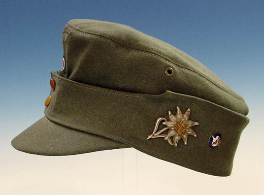 最下圖:二戰德軍山岳部隊小帽,山岳部隊特用鈕扣,及左側山岳部隊小花標。(雪絨花)