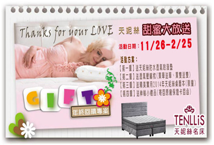 配合「年終回饋專案」,「天妮絲Tenllis」名床甜蜜大放送,【第一重】送天妮絲防水透氣哈潑墊,【第二重】送透氣壓縮枕(買單送單、買雙送雙),【第三重】送精美實用2014年天妮絲桌曆本,【第四重】送給消費者神祕禮品(寄回原廠保證卡回函)。其中,天妮絲防水透氣哈潑墊,採床包式設計,讓床墊不再怕水,透氣、防螨功能加上100%天然棉,不會破壞床墊本身睡感,並增加床墊使用壽命,即使是人體看不見的水氣也能阻隔。