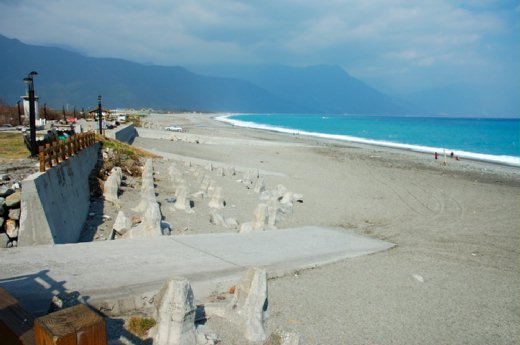 這次的花蓮二天一夜之旅,我和卡爾文設定的是渡假,所以行程不多不趕,可以好好體會花蓮人的純樸與山河之美。在所有行程的規劃中無法預約及最難掌控的就是天氣,一切只能單憑運氣,怕冷也怕熱的我,對天氣的要求可是嚴苛至極。那天,課本裡所讀到的海天一色,終於在七星潭見識到了。微冷的天氣與和煦的太陽,我只能發出一聲聲的讚嘆,用力努力的吸著海風、空氣與陽光,想把這些都儲存到我的記憶與身體裡,而卡爾文則是猛按快門,想把美麗的風景用底片做見證,因為是平常天加上龍王颱風重創的影響,遊客中心及景觀咖啡廳都尚在整修中,所以海灘人不多。安靜悠閒的在海邊散步,連小狗都忍不住伸了懶腰呢!
