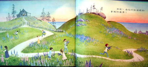 花婆婆住在海邊的一間小房子,房子的四周,開滿了藍色、紫色和粉紅色的花。