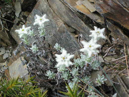 Edelweiss是歐洲純潔、高貴的小白花,也是薄雪草的一種,分佈於阿爾卑斯山、亞洲等地區,園區內的玉山薄雪草分佈於森林界限以上的裸岩或岩屑地,常見於峰頂、稜線或裸岩旁。