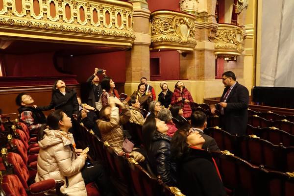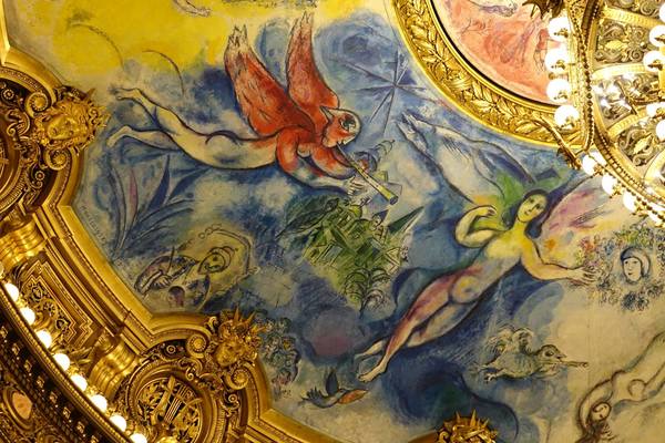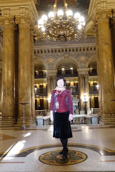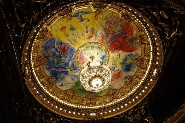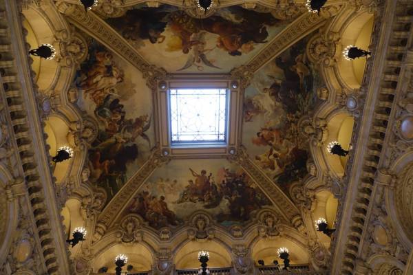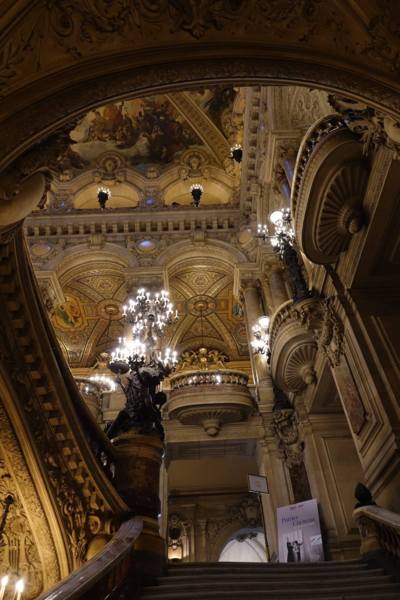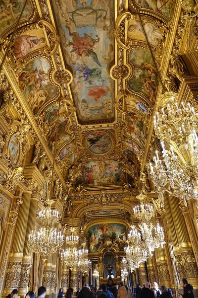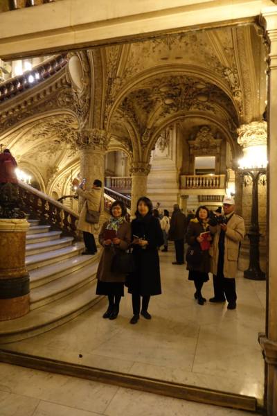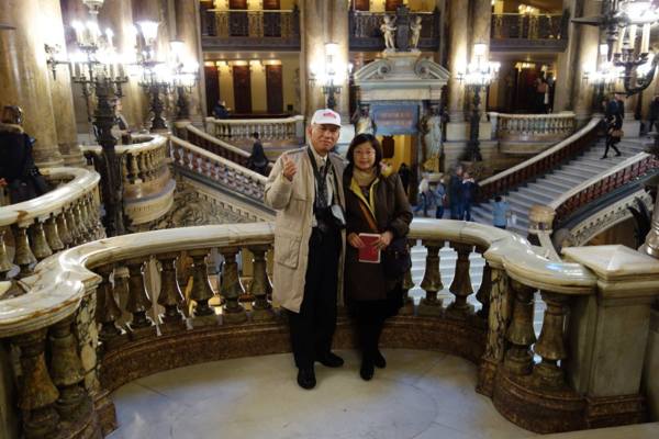 上午十點進入巴黎歌劇院內,有一位導遊帶領參觀和解說。這座於1861到 1875建造的歌劇院內部裝潢和設施比起外部的樑柱和雕刻更是豪華美麗,顯現當年的美術觀點。從大理石地板到名畫家夏卡爾彩繪的天花板和其他畫家的大幅作品、懸掛的畫和水晶燈、還有埃及、希臘、羅馬的雕塑和作品,放眼看去四處都是精雕細琢,金碧輝煌,可比美許多著名的皇宮。