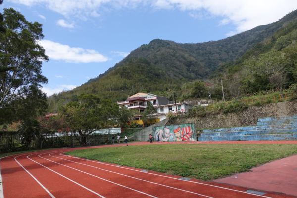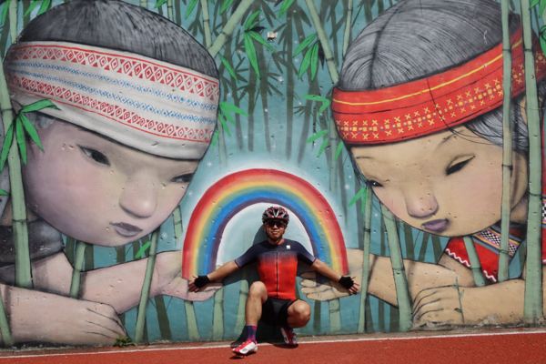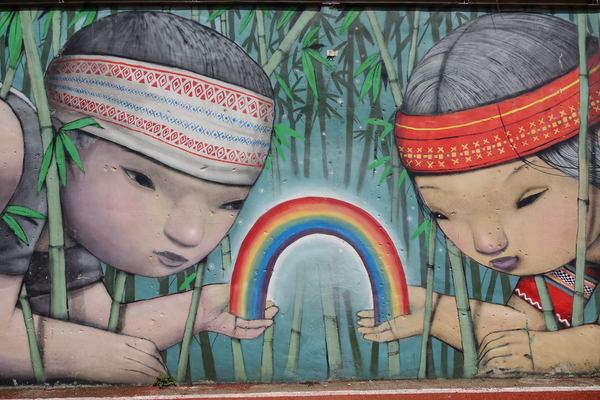 新竹尖石的錦屏國小的操場上有一牆壁畫著兩個泰雅族的小孩用手合捧著一道彩虹。人在巨大的畫前,相對渺小。在泰雅族的說中,人去世後將走上彩虹橋通往靈界,與祖靈相會。外來的畫家將在地的傳說以巨大的壁畫保留下來,能不驚豔自己擁有的美麗。2018/2/19大年初四 攝於新竹尖石