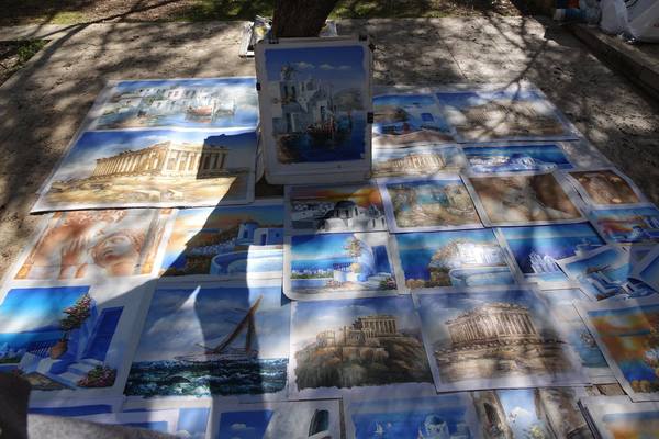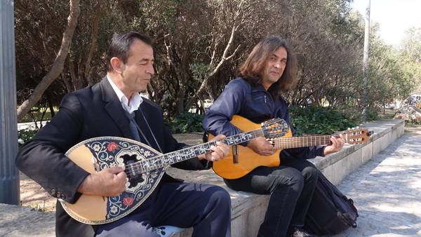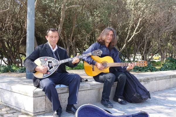 自衛城參觀過後往下走就遇見兩位街頭藝人,正在彈奏希臘的民俗音樂。一位拿著西班牙吉他,另一位抱著希臘的吉他,兩者形狀不太一樣,希臘吉他發出的聲音較清脆明亮。