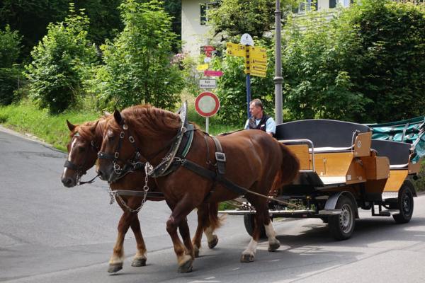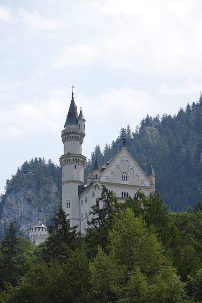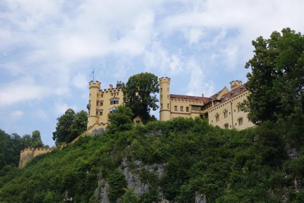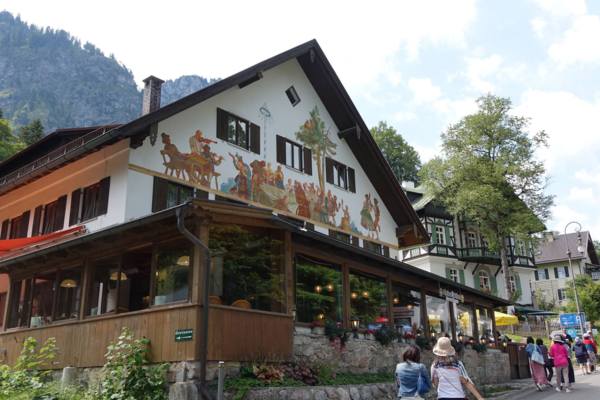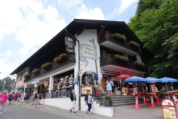 由這家餐廳的庭院即可望見山上的新天堡。此處是來參觀天鵝堡的遊客聚集的地方,除了幾家餐廳,還有紀念品商店、上山的汽車、馬車的車站。