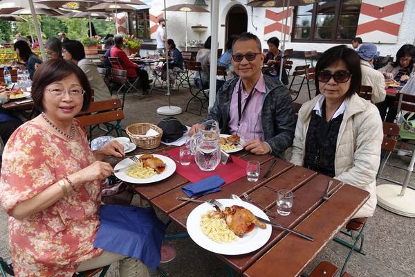 一團人來到新天鵝堡所在的山腳下時,已近中午,所以先用餐,再依照原訂參觀的時間進入古堡。午餐享用的是德式的烤雞。