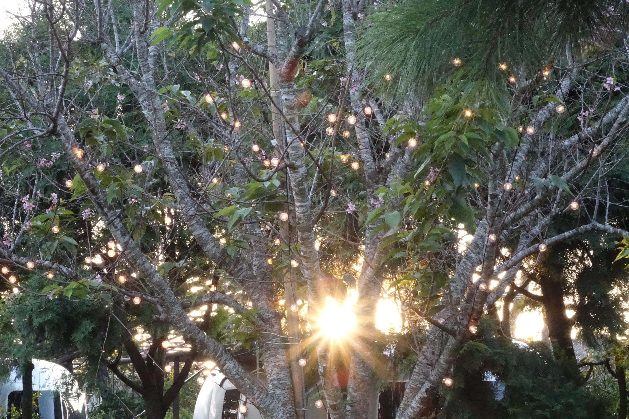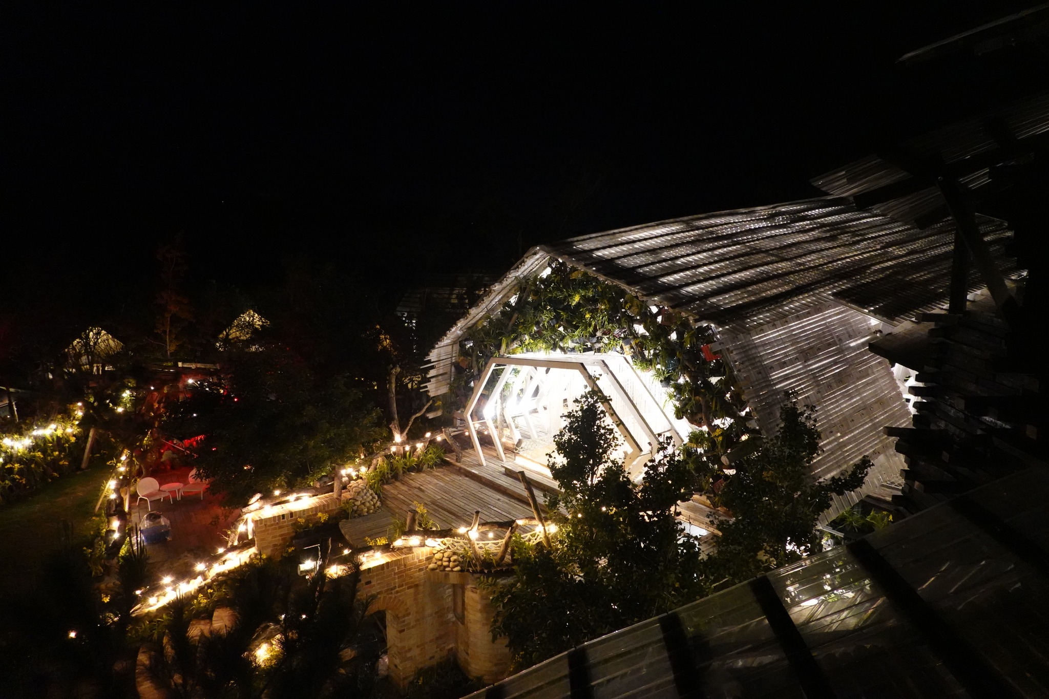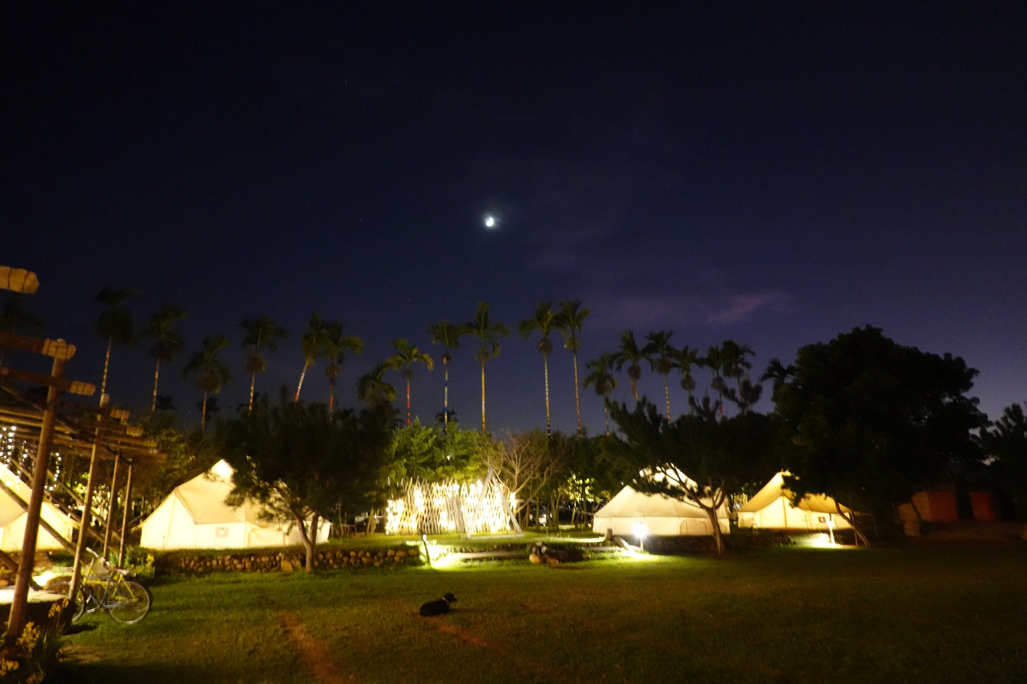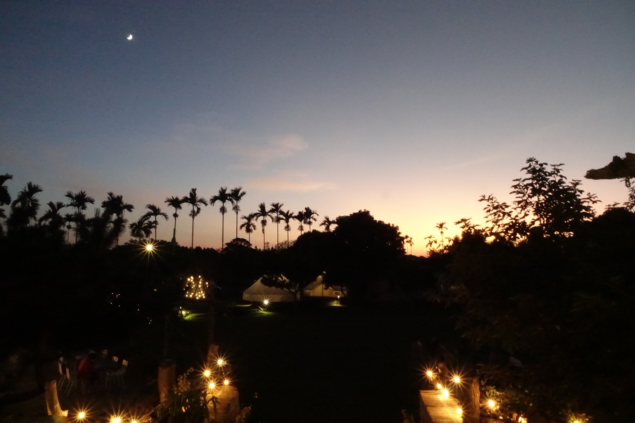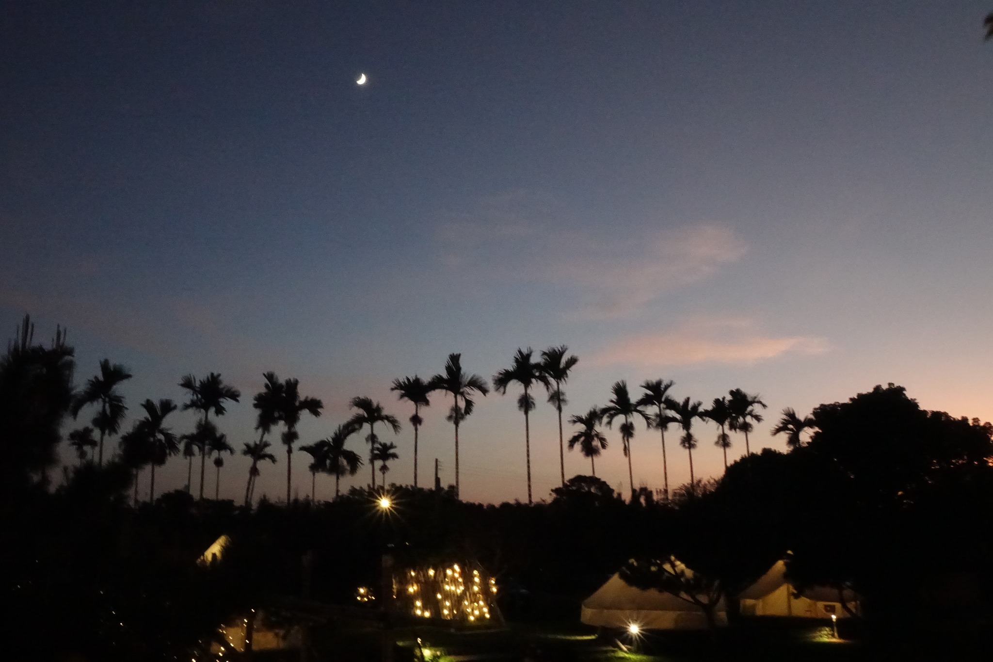 《上弦月》黃昏時,夕陽緩緩落下,露營區的燈火也點起來,一枚上弦月掛在無雲的藍天上,在安靜的夜晚看來特別明亮。2022年10月29攝於卓蘭露營地