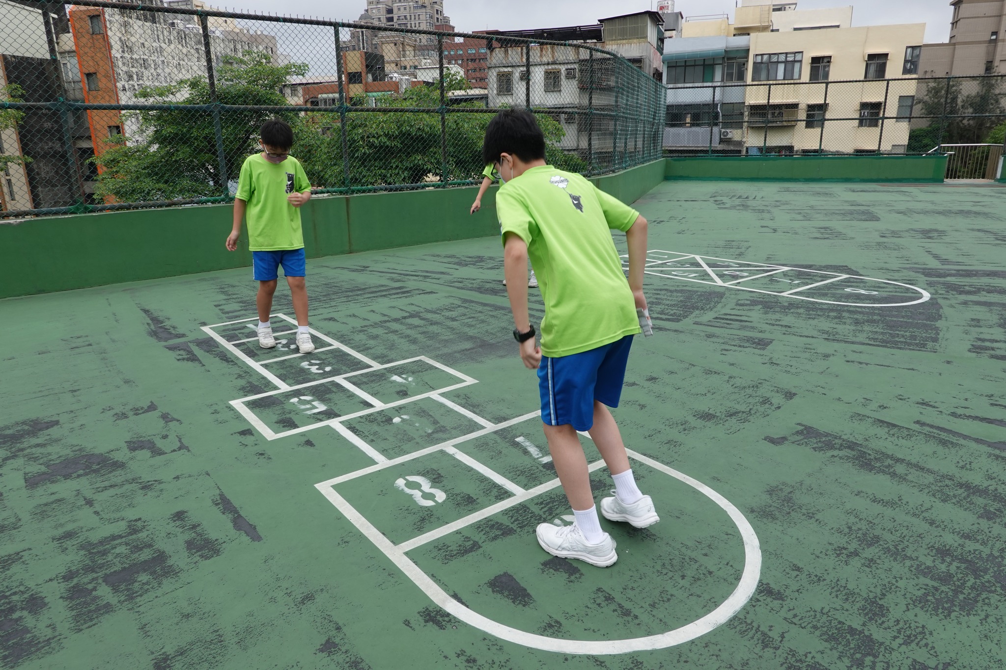 小學校的頂樓地板上畫著幾種不同圖案的格子,課間休息時,學童就來格子上跳一跳。旁觀者以前在學生時曾跳過,但是時間久遠已經記不得,看小學生在跳,滿有趣。