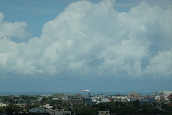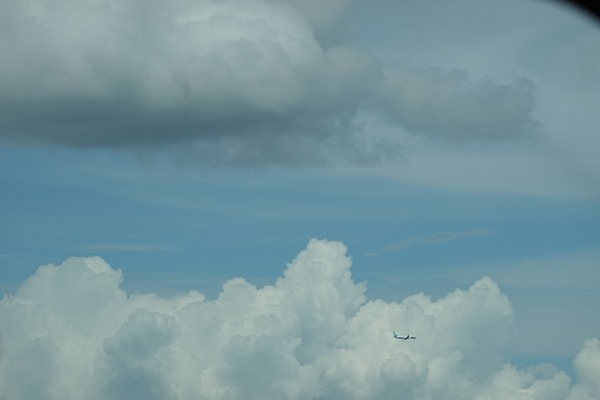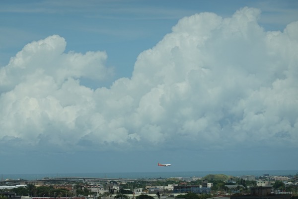 搭乘高鐵北上,時速二百多公里前行。向西邊的窗外看去,一架飛機由南向北飛行,緩緩要下降到機場,飛行速度放慢,越飛越低。拿起相機追蹤,試著捕捉幾張飛機歸航的身影。 - 2025年9月21日高鐵上