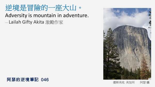 逆境是冒險的一座大山。Adversity is mountain in adventure.