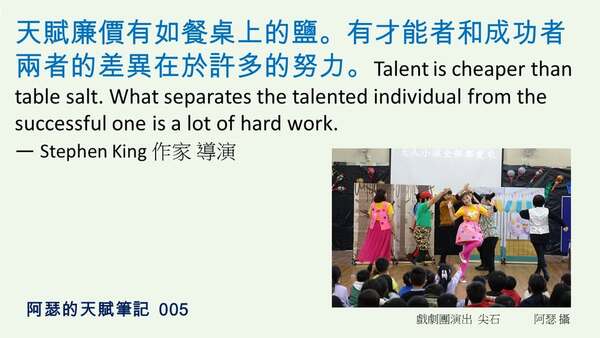 天賦廉價有如餐桌上的鹽。有才能者和成功者兩者的差異在於許多的努力。Talent is cheaper than table salt. What separates the talented individual from the successful one is a lot of hard work.