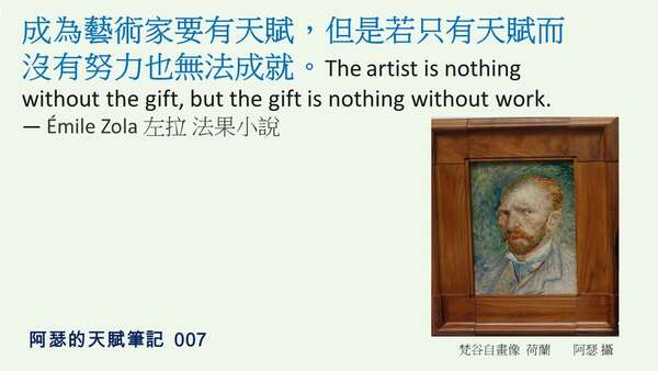 成為藝術家要有天賦,但是若只有天賦而沒有努力也無法成就。The artist is nothing without the gift, but the gift is nothing without work. ― Émile Zola 左拉 法果小說