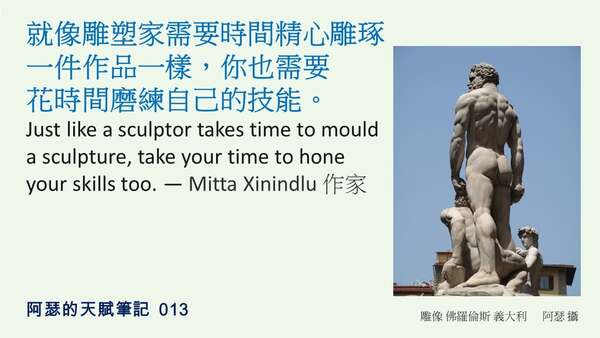 Just like a sculptor takes time to mould a sculpture, take your time to hone your skills too. ― Mitta Xinindlu 作家
