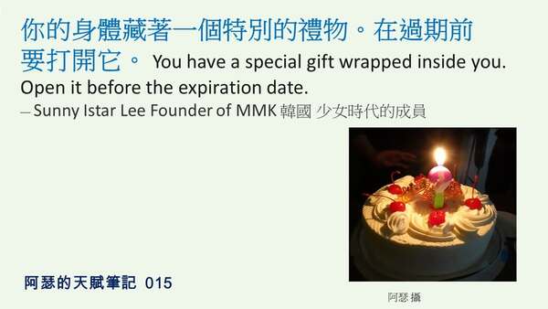 你的身體藏著一個特別的禮物。在過期前要打開它。 You have a special gift wrapped inside you. Open it before the expiration date.