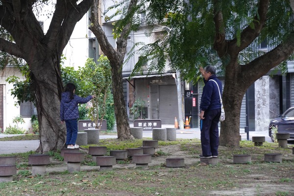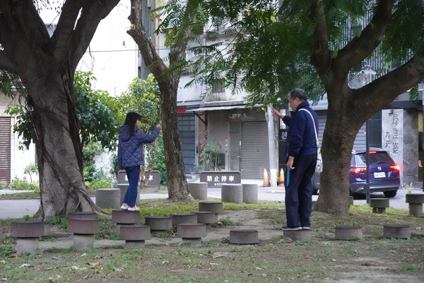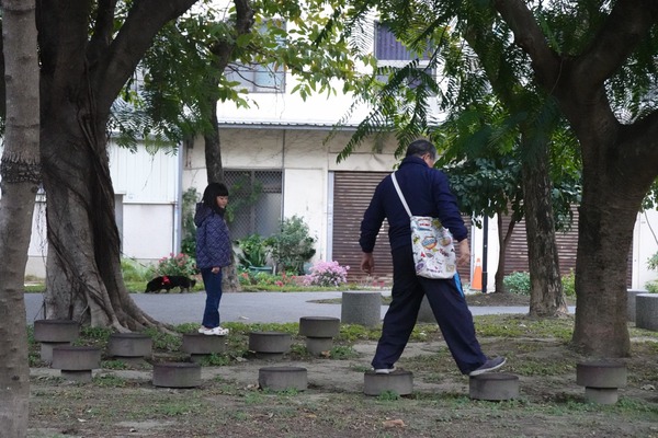 黃昏時走路經過一公園,看見樹底下有一位小女孩和祖父正在玩剪刀石頭布的遊戲,兩人分站不同的石頭上,用手猜拳,贏的人向前跳一步。有時小女孩贏,有時阿公贏,兩人似乎玩得很愉快,這樣的場景路人看來很溫馨和有趣。不論輸贏,他兩人都贏得了一個快樂的時光和美好的回憶。 2025年11月28日攝於新竹