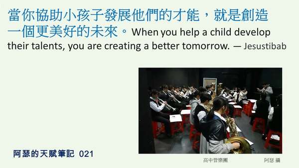 當你協助小孩子發展他們的才能,就是創造一個更美好的未來。When you help a child develop their talents, you are creating a better tomorrow. ― Jesustibab