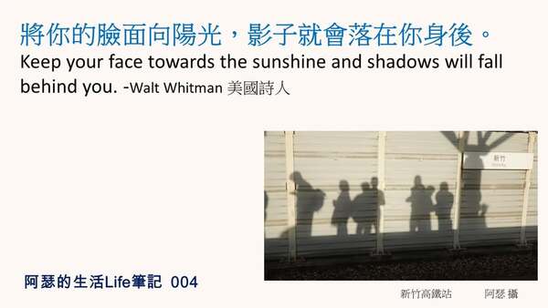 Keep your face towards the sunshine and shadows will fall behind you. -Walt Whitman 美國詩人