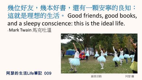 幾位好友,幾本好書,還有一顆安寧的良知:這就是理想的生活。 Good friends, good books, and a sleepy conscience: this is the ideal life. - Mark Twain 馬克吐溫