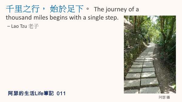千里之行, 始於足下。 The journey of a thousand miles begins with a single step. – Lao Tzu 老子