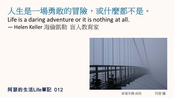 人生是一場勇敢的冒險,或什麼都不是。 Life is a daring adventure or it is nothing at all. — Helen Keller 海倫凱勒 盲人教育家