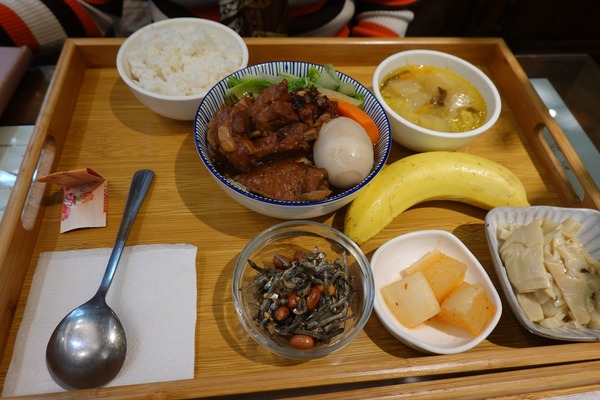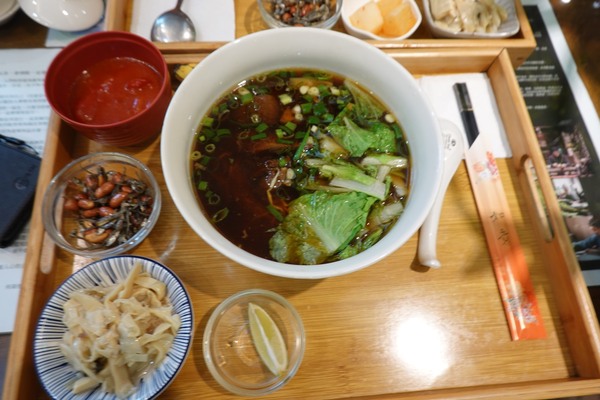 午間來到設在竹科裡的一家牛肉麵餐廳。牛肉麵店四處都有,每一家的烹飪的方法卻有別,各有各的風味和優點。這一家牛肉麵餐廳的特色是除了牛肉麵本身烹調味道有特色之外,餐廳內布置有圖書、畫作、字畫、茶具和盆栽,客人彷彿置身於室外的庭院裡用餐。這位老闆過去曾服務於竹科裡的一家科技公司擔任高階主管,因故轉職成美食家,餐廳的陳設充滿文人的氣息,使用餐的客人感覺更優雅一些。 2026年2月攝於新竹