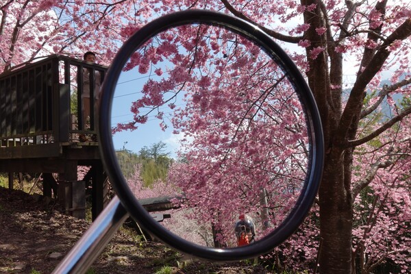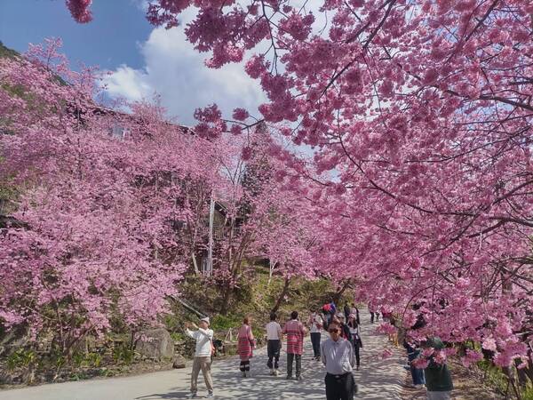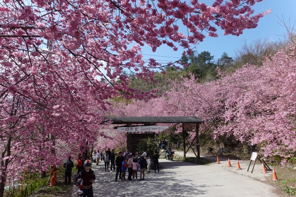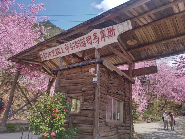翻山越嶺來到司馬庫斯部落,午後進入司馬庫斯的大門,首先看到的是馬路旁兩排粉紅盛開的櫻花在風中輕輕搖曳,好像熱烈歡迎遠來的遊客。陽光和藍天下,盛開的櫻花如天上的繁星數不清,遊客下車後趕緊來大門附近拍照,留下這一年一度難得一見的櫻花盛況。 2026年2月攝於新竹尖石