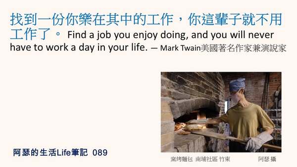 找到一份你樂在其中的工作,你這輩子就不用工作了。 Find a job you enjoy doing, and you will never have to work a day in your life. ― Mark Twain美國著名作家兼演說