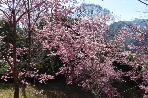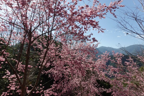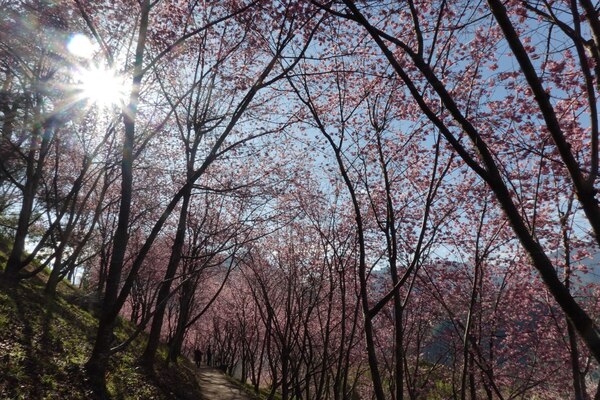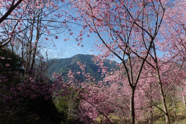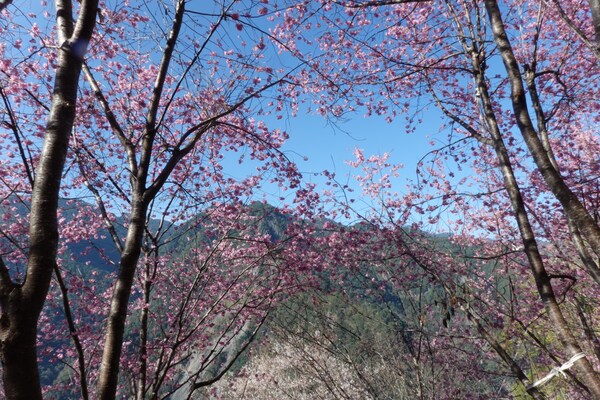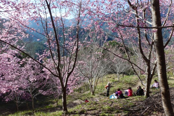 一團人在早餐後出發走巨木步道,來到2.3K就可看見滿山粉紅的櫻花,這些櫻花是在2013年種植,共有206棵六種不同種的櫻花,經過十年多已經長成一片櫻花林,成為司馬庫斯每年二月最美麗的景點,吸引大量遊客進園賞櫻。遊客幾乎人手一機,企圖將這一片美景盡拍攝下來,或是在櫻花樹下留下倩影。最愜意的是幾個人坐在櫻花林下,曬溫暖的陽光並和同行的夥伴抬頭欣賞這一片藍天下的山林 。 2026年2月攝於新竹尖石司馬庫斯