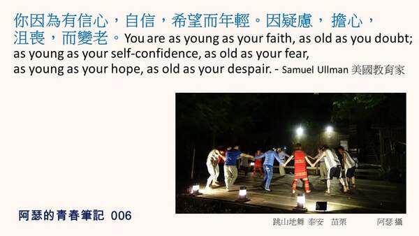 你因為有信心,自信,希望而年輕。因疑慮,擔心,沮喪,而變老。You are as young as your faith, as old as you doubt;as young as your self-confidence, as old as your fear, as young as your hope, as old as your despair. - Samuel Ullman 美國教育家