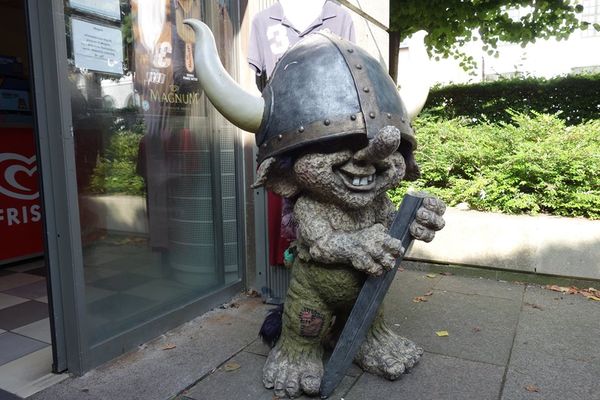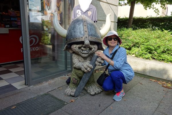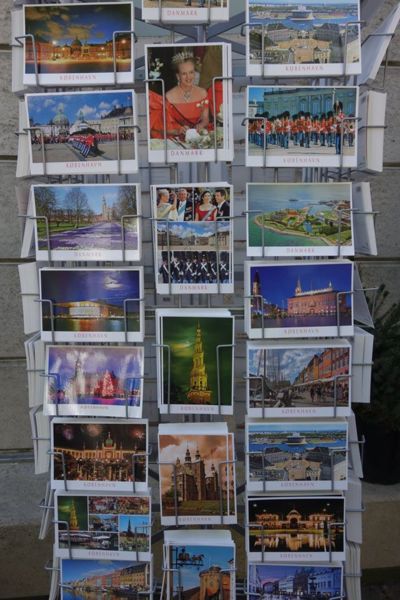 每個觀光景點都有一些具有當地特色的紀念品。哥本哈根的紀念品店前站著兩個小矮人,一個是大鼻子帶頭盔持刀的維京侏儒,另一個是全身雪白的侏儒,他們都是調皮愛作弄人。明信片就印有丹麥皇室、小美人魚和幾個熱門景點的相片。2016/6/23 攝