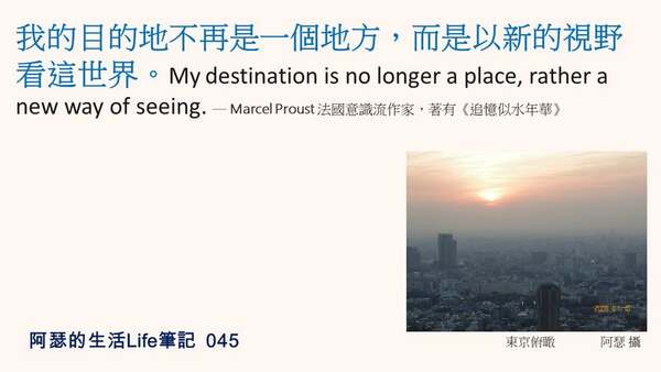 我的目的地不再是一個地方,而是以新的視野看這世界。My destination is no longer a place, rather a new way of seeing. ― Marcel P...