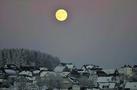 今年12月12日月亮特別大又特別亮,高掛在德國中部小鎮文特伯格的上空。月亮與地球的平均距離是38萬4,400公里,但這輪滿月距地球只有35萬6,567公里,因此看起來比平常的滿月大了14%,亮度也增加30%。(歐新社)