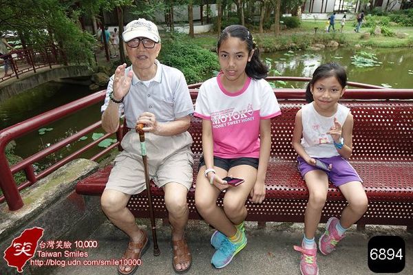 八十五歲高齡的阿公在兩孫女的陪同下到荷花池畔散步 - 2016/5/8攝於竹科靜心湖