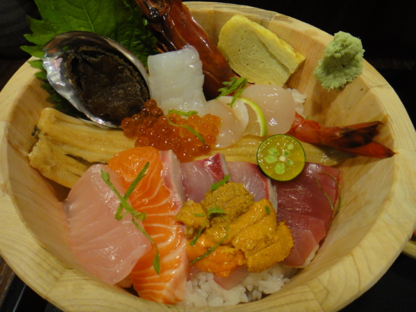 這丼飯的碗是老闆特別訂做的,因為檜木不能接觸清潔劑,所以每天晚上都要花費很多工夫跟時間使用溫水和抹布慢慢的清洗,用檜木碗裝海鮮飯,應該是全台灣首見吧!吃之前在想會不會木頭的味道和海鮮丼飯不搭,結果是我多慮了XD檜木豪華海鮮丼裡面有:鮭魚、鮪魚、紅甘、海膽、干貝、星鰻、花枝、九孔鮑魚和一隻超大牡丹蝦,新鮮不用說,加上現磨的蘿蔔絲和山葵,不論是直接吃或是蘸上少許醬油提味,都讓人沉浸在這碗有淡淡檜木香味的海鮮饗宴裡!
