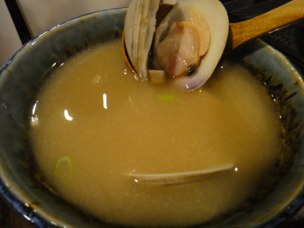 來丼屋常常都會來上一碗,老闆會把當天的大蛤蜊放在吧檯上面的水盆裡面吐沙。湯的口味很清淡,新鮮的蛤蜊讓湯不用特別下薑來去腥,飽滿的蛤蜊肉加上鮮甜的湯頭,恰好當今天這餐的句點