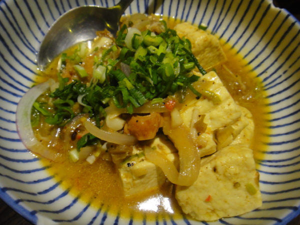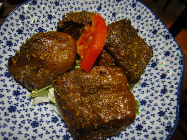 店家強力推薦下,點了它,之前總覺得豆干好吃也就這樣,不過這道的確讓人驚豔!將整塊豆干不切連皮烤的微焦,並且讓他吸滿醬汁,咬下的一瞬間就連醬汁一起在嘴巴爆開,豆干也不會太硬,溫溫的十分軟嫩,不愧是店家招牌菜之一