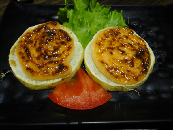 切片山藥不會太厚方便咀嚼,將山藥微烤後放上明太子,再將明太子炙烤到微焦(推測的過程),山藥很脆,明太子入口及化,明太子的鹹味跟山藥配起來讓整道菜變得比較清淡,是很棒的組合