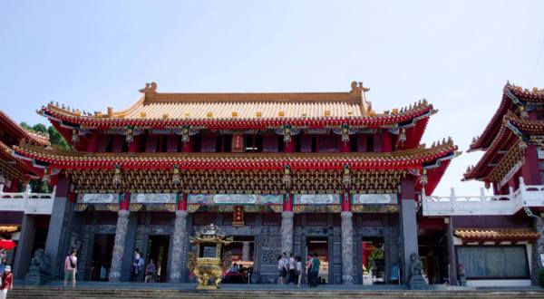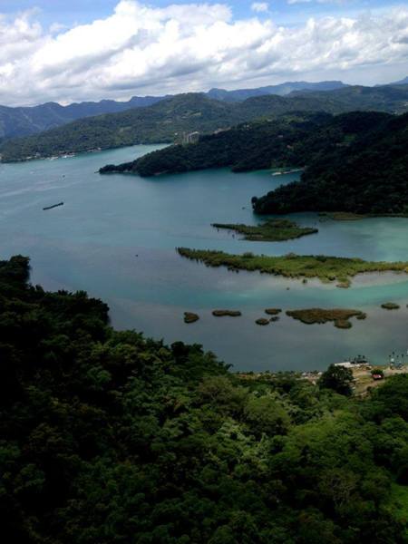 離開車程終於要前往日月潭啦!中間騎了一條捷徑,路上都沒有車只有滿山滿谷的檳榔樹,騎到差點睡著…到了環潭公路,第一站是正在整修的文武廟,正門口有日月潭三個大字的石碑,一堆陸客聚集在拍照…我們看到旁邊的香腸忍不住買了兩條,100(貴><