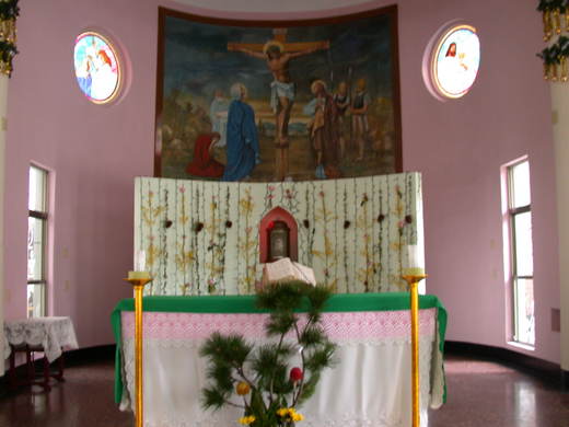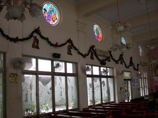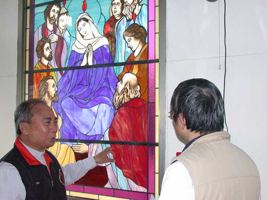 鑲嵌玻璃是主任思鐸吳終源神父央請丁松青神父製作,丁神父看過教堂的環境後也欣然同意,唯一的條件是「不能催喔」,果真,經歷一年多的製作時間,美麗出色的鑲嵌玻璃於焉誕生,為教堂增色甚多。