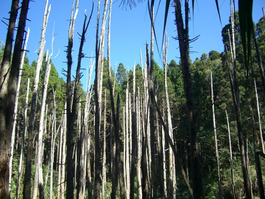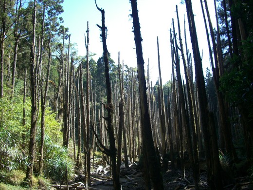 據說忘憂森林以前是個堰塞湖,大片的白木林應該是長久浸泡水中淹死的吧!這幾年雨水少,於是湖水由地下自行消失了!11/28、12/5這兩天氣溫、濕度雖略有差異,但仍然是藍藍的天、迷人的日照,沒有網路上那大片淒迷的湖面、縹緲的山嵐,白木群依舊直立孤獨著‧‧‧