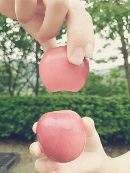 如果還是無法想像樂淇蘋果到底有多迷你,舉大家比較孰悉的日本富士蘋果來比一比好了,大家可能會比較有概念,體積大約差到2倍,是不是真的非常精巧可愛~但是蘋果體型雖小卻又相當美味,裡面的營養度和吃起來香、脆、甜,又多汁的口感可是不輸人喔!