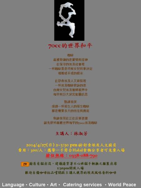 一杯埃及風味的咖啡,在台灣發酵著【70cc的世界和平】計畫,信任與勇氣的反饋,療癒了主講者對母親故鄉這條臍帶的結。無論你現在正在反著甚麼,請來飲杯傳遞世界和平的70cc埃及咖啡。