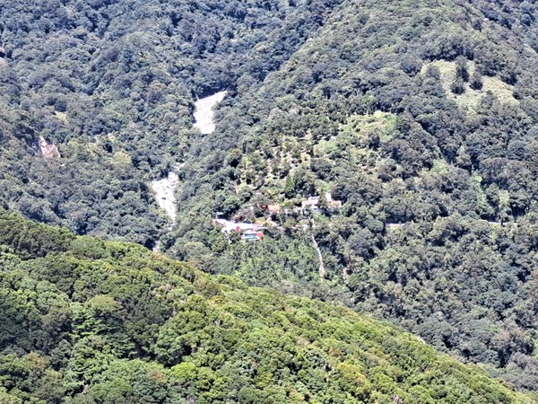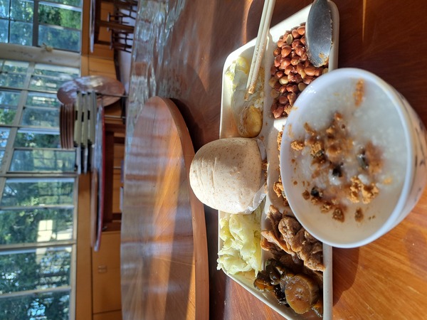 昨夜山上一直下雨,今早天光乍現時雨已停歇,山上霧氣凝重,山莊在樹林的懷抱中特別寧靜。由於上山的旅客不多,今天的早餐只有簡單的中式稀飯配台式小菜,但在物資缺乏的高山上,這已經是可以比美五星級飯店的精神款待了。